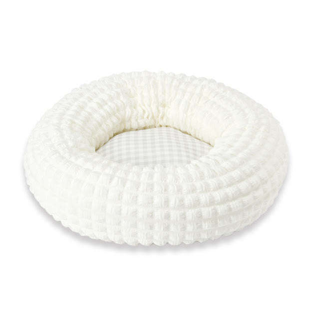 はじけたポップコーンのような立体的な生地が魅力のラウンドベッド。 ベッドの中で丸まったり、縁にアゴを乗せたり、座布団のように座ったり、様々なくつろぎ方ができます。