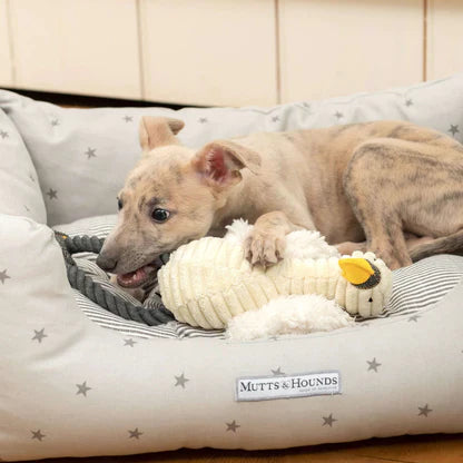 ふんわりとしたやわらかな羽、ロープの足が魅力の白鳥のぬいぐるみ。お腹にはスクウィーカー、ふわふわの羽にはカシャカシャと音がなるクリンクル素材、足はロープなので触れても噛んでも楽しく、飽きずに長く遊べます。全体的に丈夫なので噛み噛み遊びに最適。